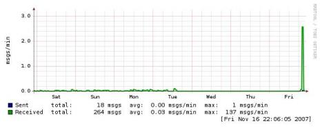 Legger ved et bilde som greit illustrerer nedetiden som har vært denne uka. Grafen viser e-post levert/ikke-levert én uke tilbake i tid. Som man ser ble det *plutselig* levert en hel del e-post på fredag, mens det var helt dødt fra tirsdag og utover.